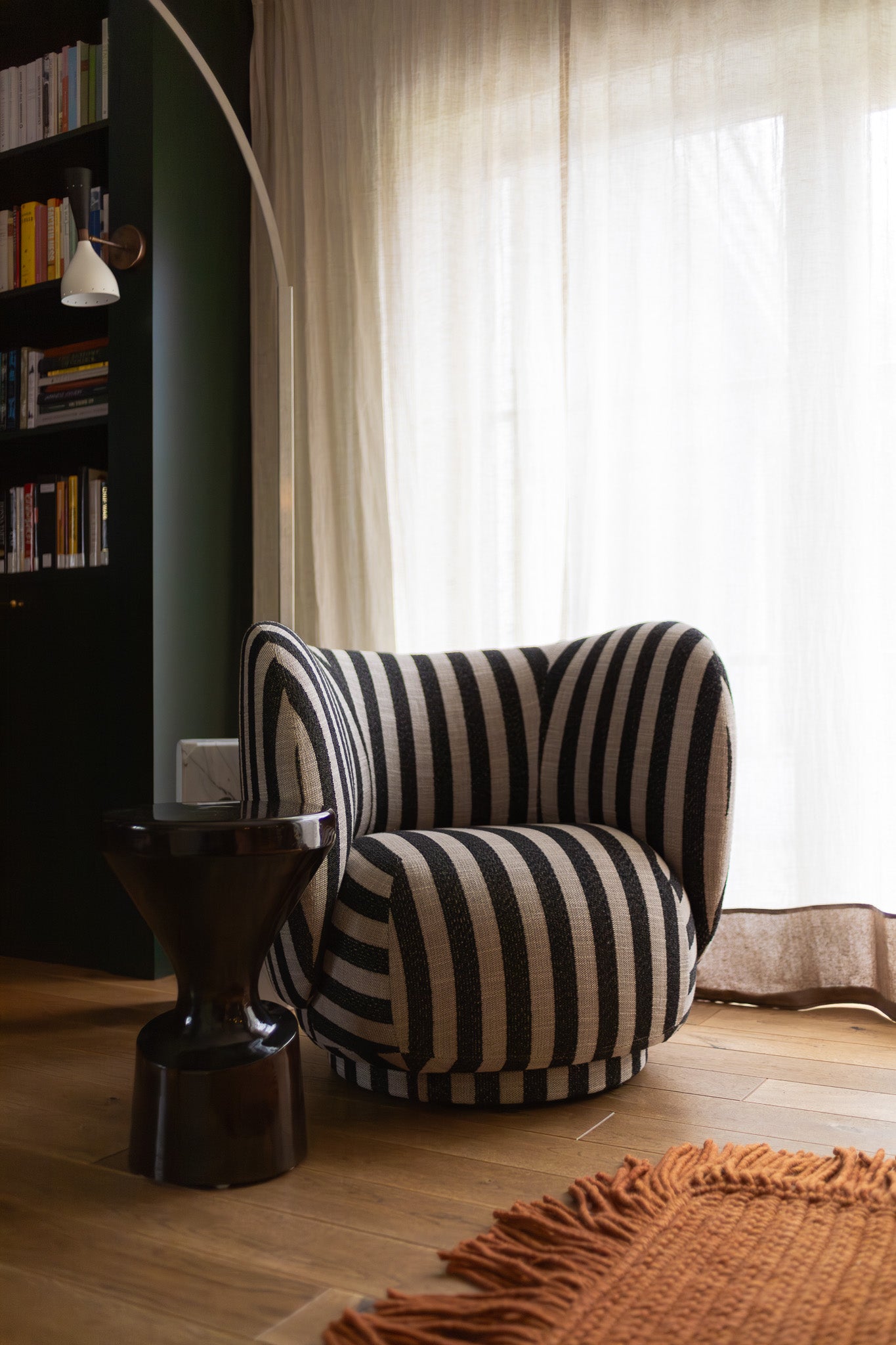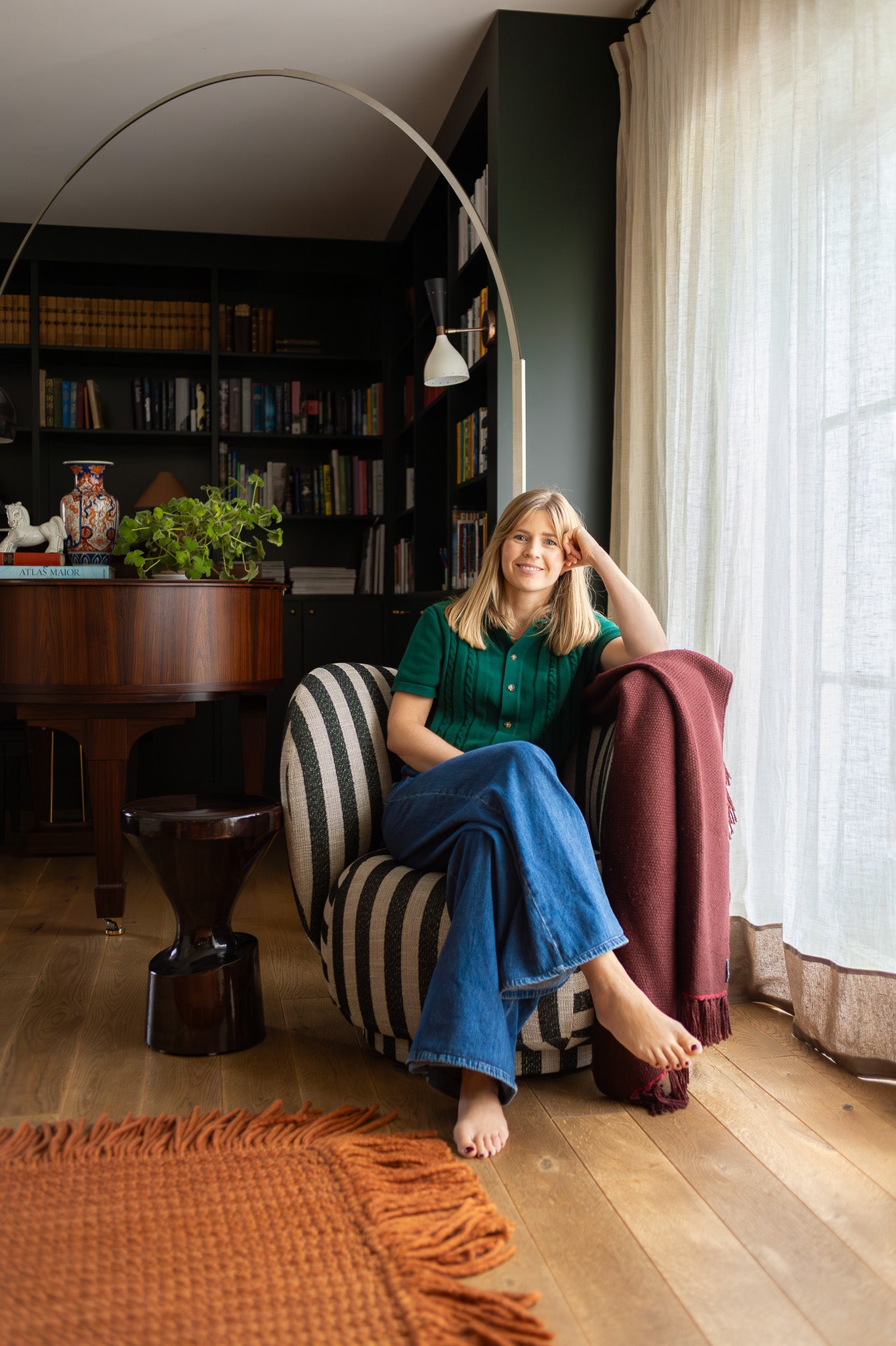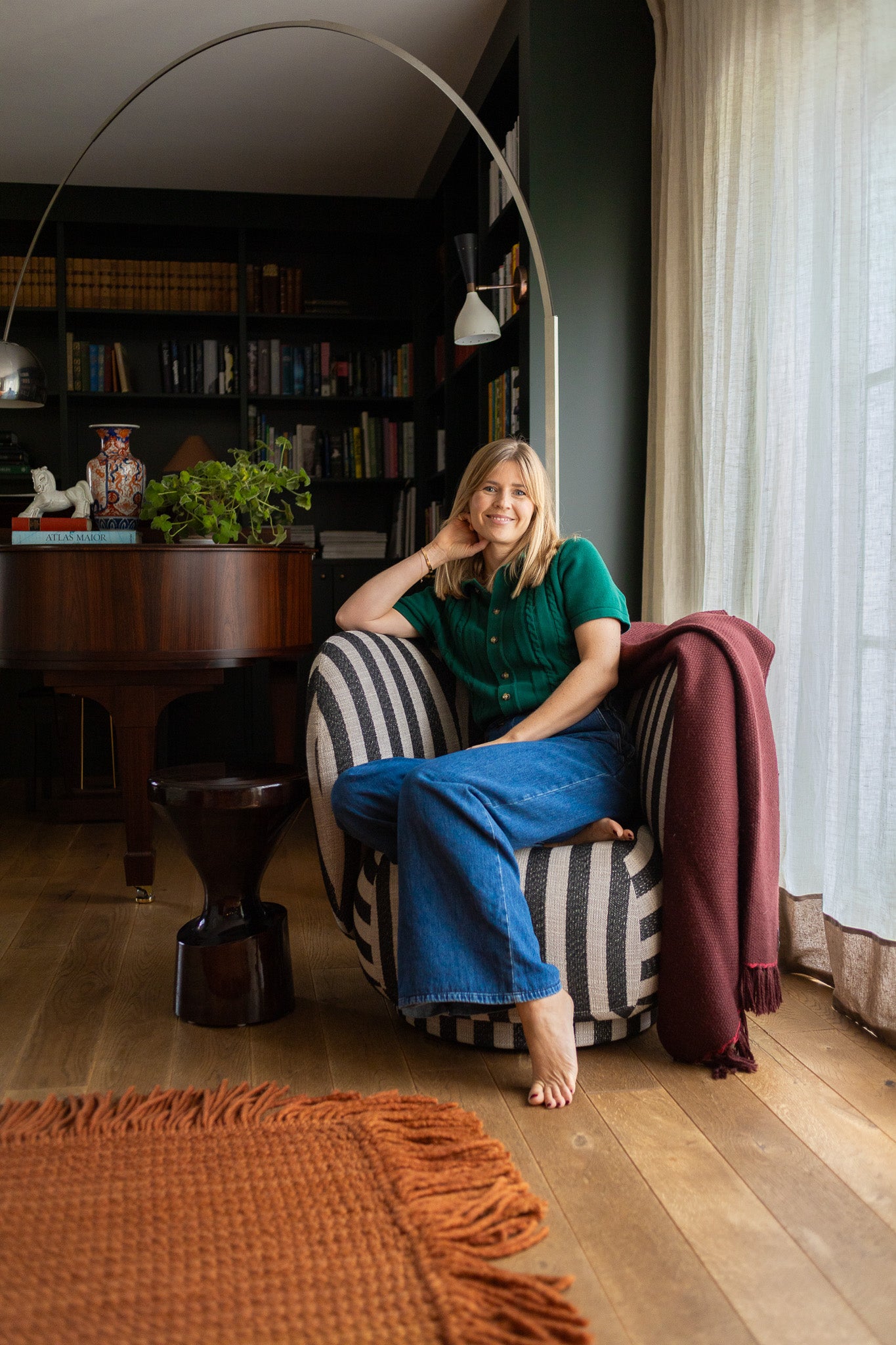 I dag står den skulpturelle lenestolen Rico fra Ferm Living ved vinduet, i nærhet til flygelet og bokhyllen. Der den står nå gir den skue ut mot hagen, og så kan den flyttes og bli en del av sofasonen når flere samles. Formen og det stripete tekstilet gjør at den passer godt inn i den litt lekne og personlig innredede stuen. Den står naturlig side om side med flere arvemøbler, unike bruktfunn og nyere designobjekter.