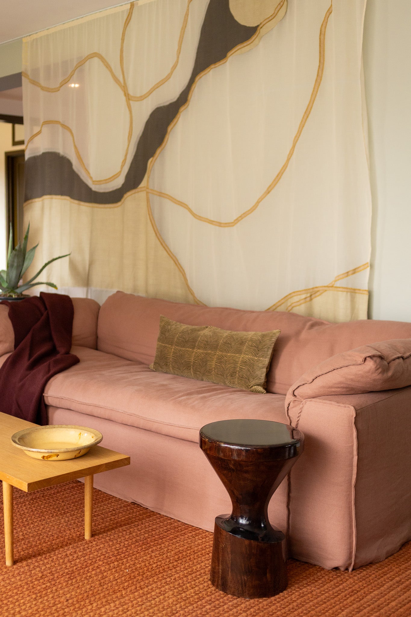 Personlig og lekent. Merete er glad i å bruke farger og fargesammensetninger som stemningsskaper i hjemmet. En støvrosa sofa fra Hk Living har dermed også fått plass i stuen der Rico står. Draperiet bak sofaen fra Rest Designstudio (der Merete er en av grunnleggerne) er designet av overskudd-og resttekstiler og fungerer både som et kunstverk og en visuell romdeler.