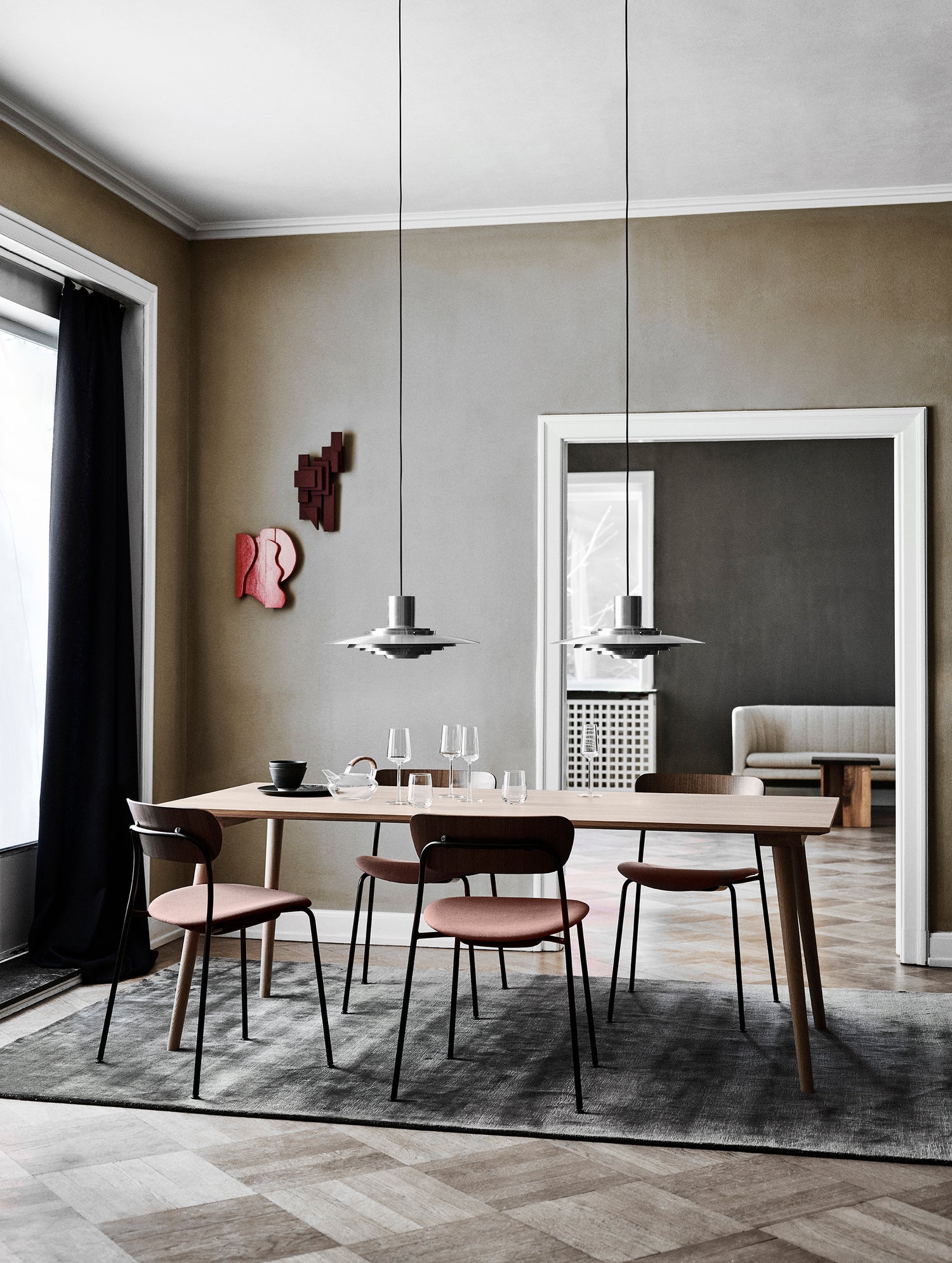 Stolen Pavilion fra &tradition, ble designet av norske Anderssen & Voll til den historiske restauranten Langeline Pavilionen i København. Designerne ville lage en kobling mellom det modernistiske bygget fra 50-tallet og stolen ved å skape en ny modernisme. Den nydelige stolen Pavilion har myke rene linjer, er er laget av bøyd kryssfiner og pulverlakkerte metallrør - og kan stables. I denne polstrede varianten uten armlener kan du velge mellom flere ulike sammensetninger: Base i svartlakkert metall eller blank krom, rygg i eik, valnøtt eller svartlakkert eik og polstret sete i flere ulike typer tekstiler og skinn. Vil du ha hjelp til å finne ut hva som passer best hjemme hos deg er det bare å sende oss en mail på hello@oslodeco.no!