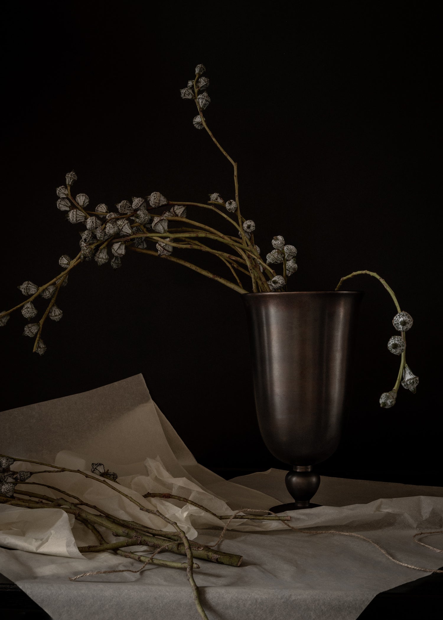 Colin King har designet en serie dekorative objekter for Audo Copenhagen som inspirerer oss til å lage fine stilleben hjemme. Vi elsker den stemningsfulle stilen til Colin King, som preges av dansende former, tunge materialer og store proporsjoner. Vasen Pavot henter inspirasjon fra en valmueblomst, og er støpt i aluminium med vakker mørk bronsefarget patina. Bruk vasen med blomster eller greiner for å tilføre dybde og karakter til spisebordet eller sidebordet – eller la den stå alene som et skulpturelt innslag i rommet.