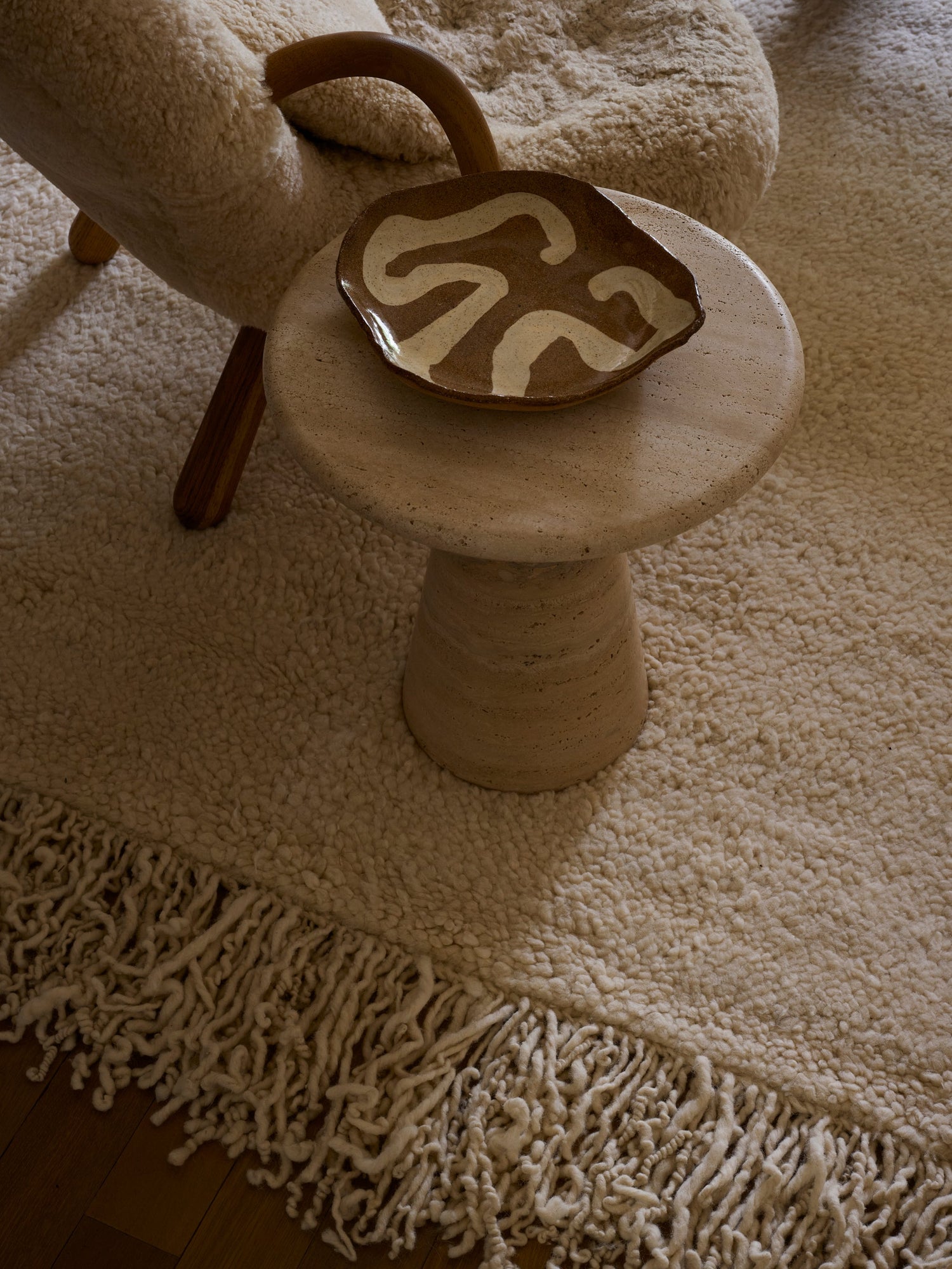 Teppet no.10 fra Cappelen Dimyr er et lyst elegant klassisk formet teppe som innehar noen ekstra fine detaljer. Teppet er laget i luksuriøs tykk off-whitefarget ull med kort lugg og krøllete frynser rammer inn hele teppet. Vi elsker det litt overdrevne uttrykket! Om dette får plass i stuen eller på soverommet vil det skape en deilig myk stemning. Teppet er spesielt nydelig i kombinasjon med andre naturmaterialer og detaljer i treverk, stein og keramikk. Teppet er håndvevd og laget i naturlig, ubleket New Zealand-ull og bomull og kommer i to størrelser: 230x280 cm og 290x350 cm.