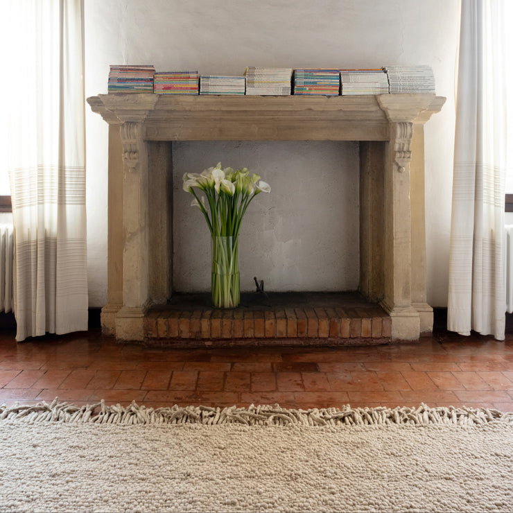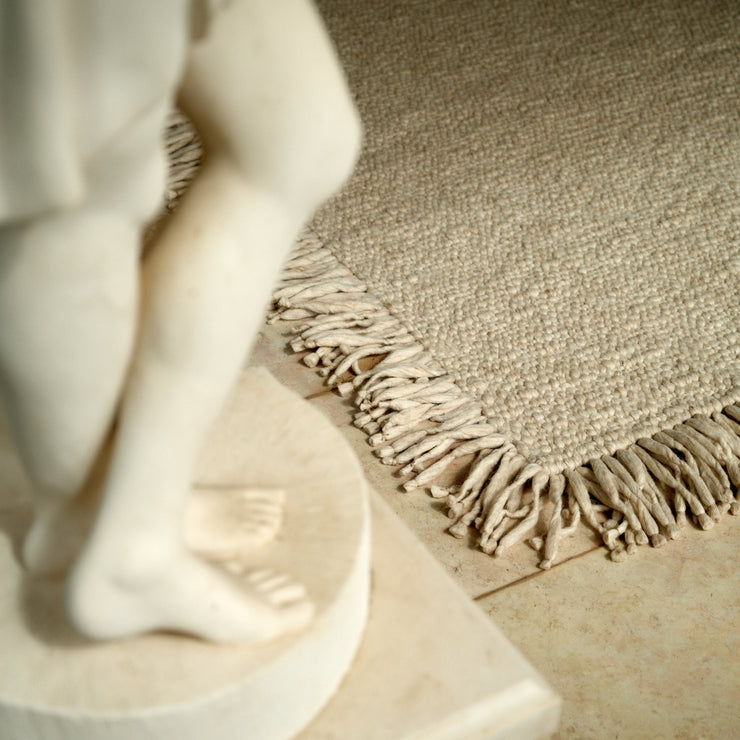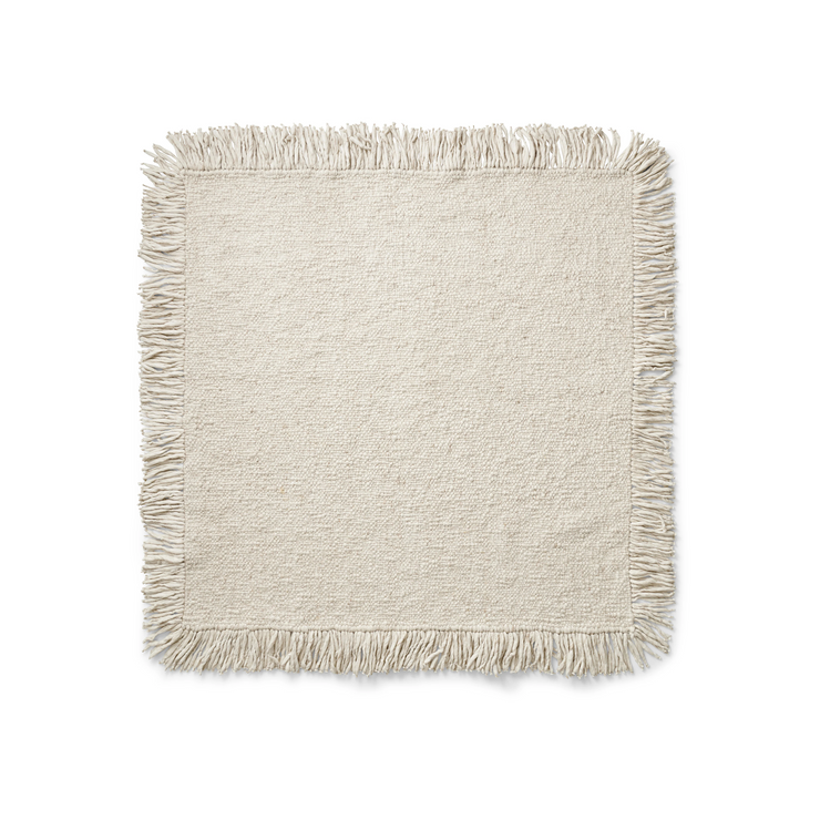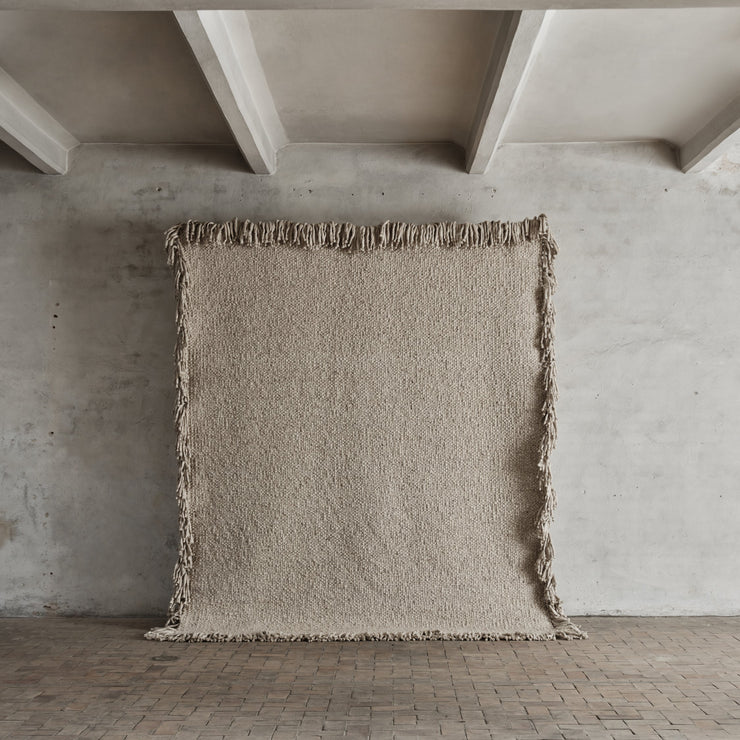 Teppet no.12 fra Cappelen Dimyr er et rustikt teppe laget av luksuriøs, kraftig naturfarget ull i en klassisk kurvflettekonstruksjon. Det kraftige og overdimensjonerte garnet går gjennom hele teppet og ender over i tykke ullfrynser langs sidene, laget av samme garn. Så fint! Teppet er håndvevd og laget i naturlig, ubleket New Zealand-ull og bomull og kommer i to størrelser: 200x260 cm og 240x320 cm.