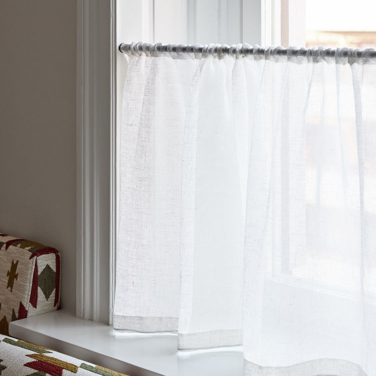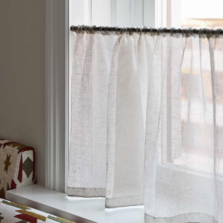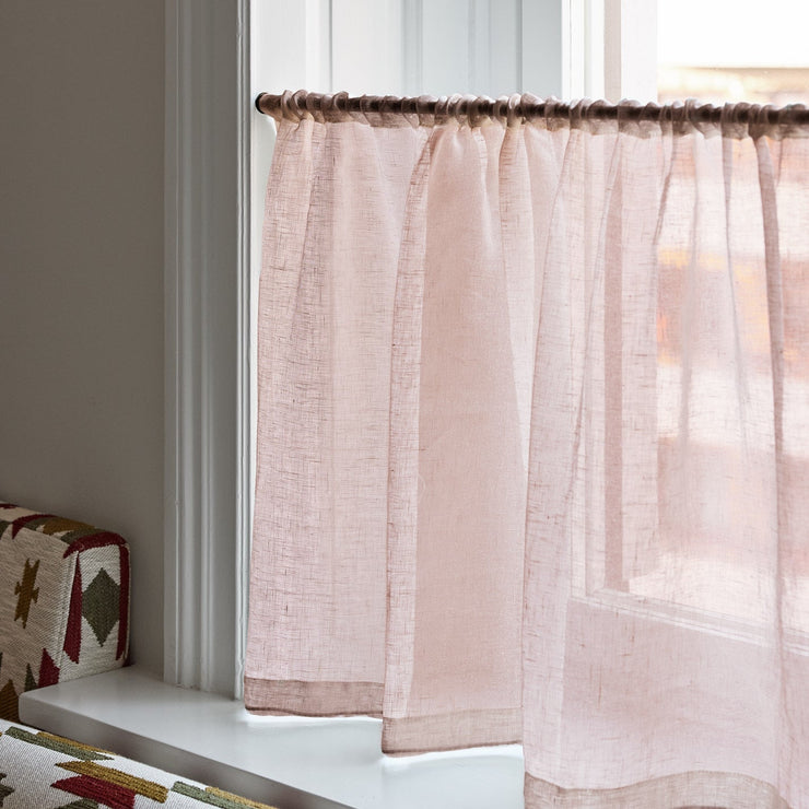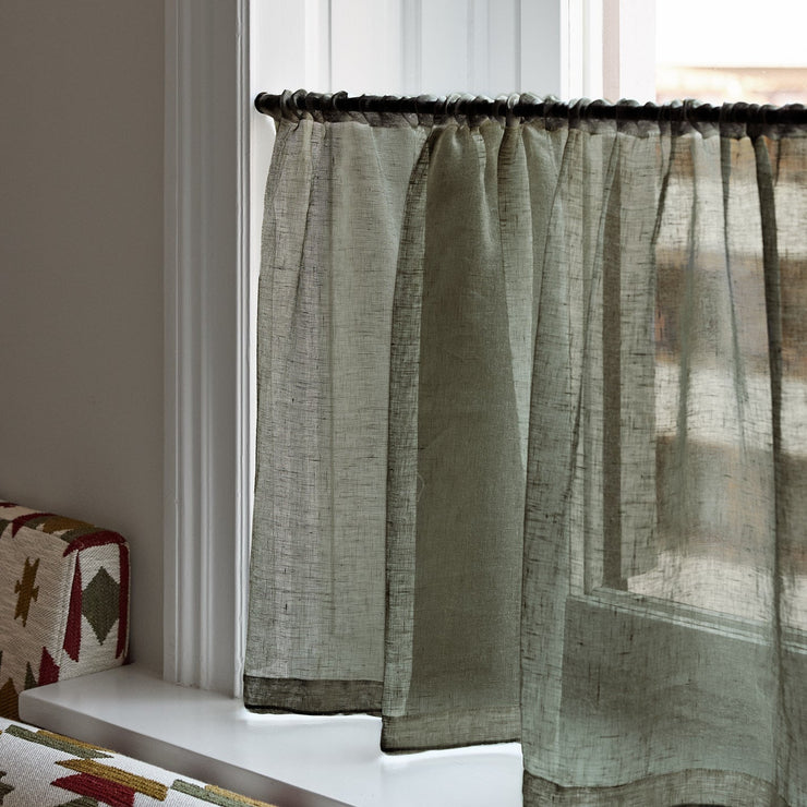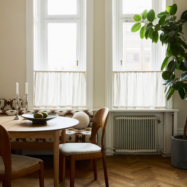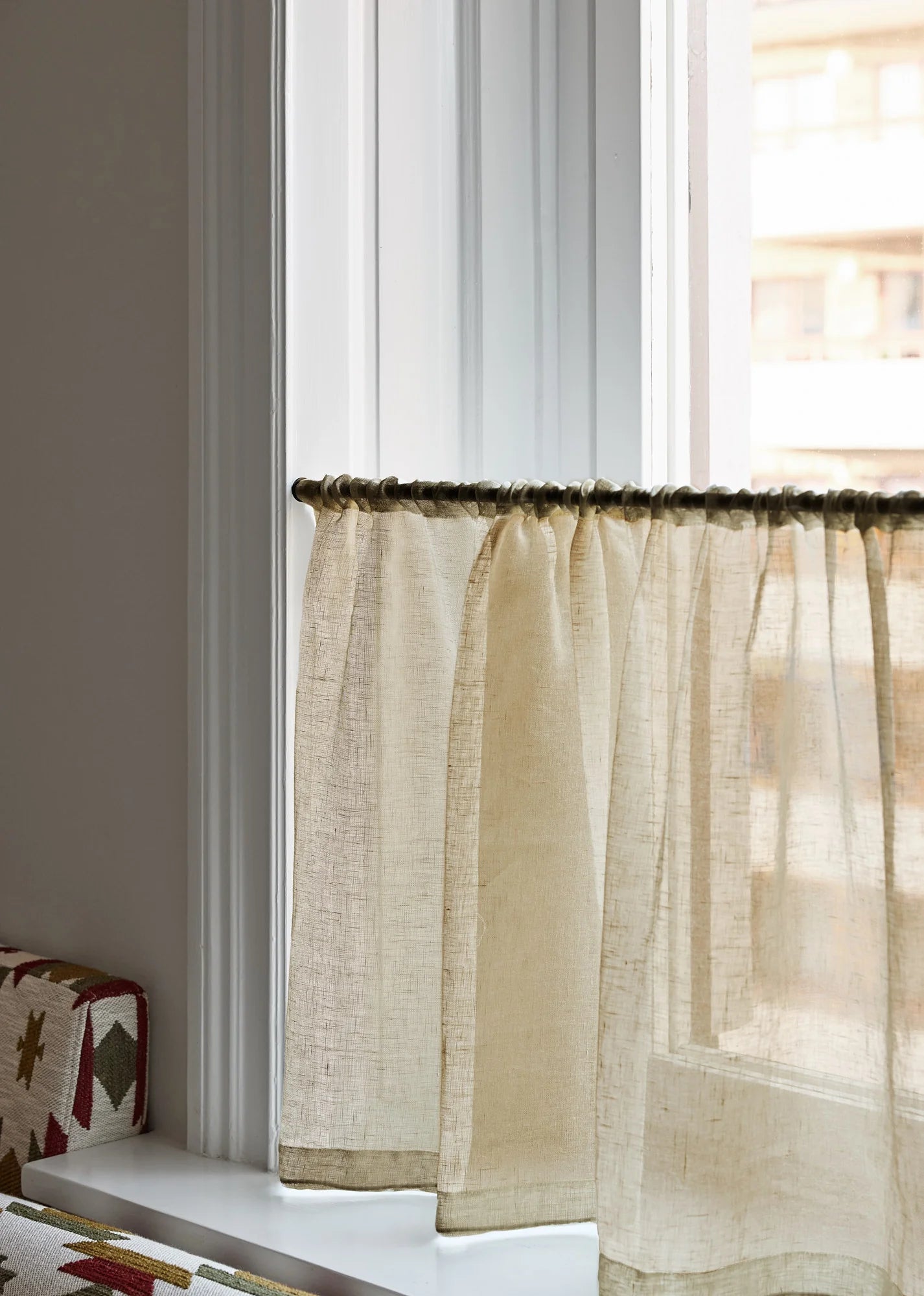 Gardinene selges enkeltvis.Materiale: Velg mellom vevd lin (67% lin og 33% viskose) eller tynn lin (100% lin)Info: Gardinen leveres komplett med en gardinstang (12 mm i diameter, i bronsefinish) og med to veggbraketter. Gardinstangen spennes i vinduskarmen. Gardinen har en toppkanal designet for å passe til den medfølgende gardinstangen og et tyngdekantbånd du kan ha gardinlodd i, om ønskelig. Lengden på stangen og gardinen skal samsvare med bredden på vinduet (innvendig vindusforing). Maks bredde er 200 cm, maks høyde er 70 cm. Merk at de to festene i hver ende bygger 0,6 cm tilsammen – dette må trekkes fra totalbredde. Bredde må oppgis i hele cm. Ta kontakt på kundeservice@oslodeco.no så hjelper vi deg med bestillingen.