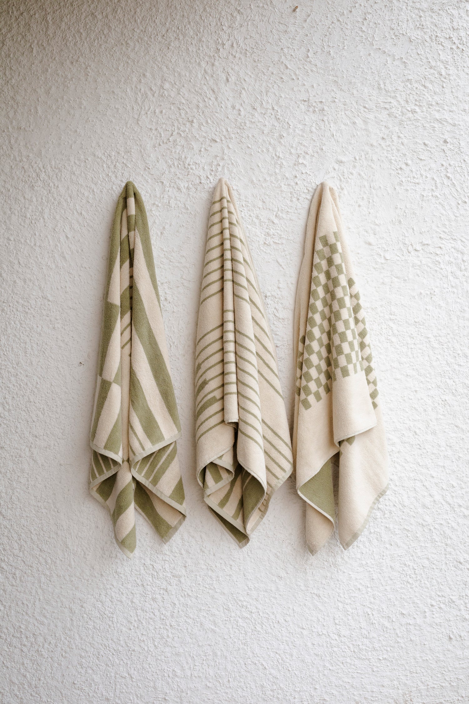 Håndklærne har fått grafiske mønstre med ruter og striper, inspirert av gamle franske vevteknikker. Fargekombinasjonen er myk og behagelig, i kremhvitt og dus grønt. De tre håndklærne har samme fargepalett og stil, men ulik design – ett med ruter, og to med striper. Det er en sammensatt trio som hører sammen.
