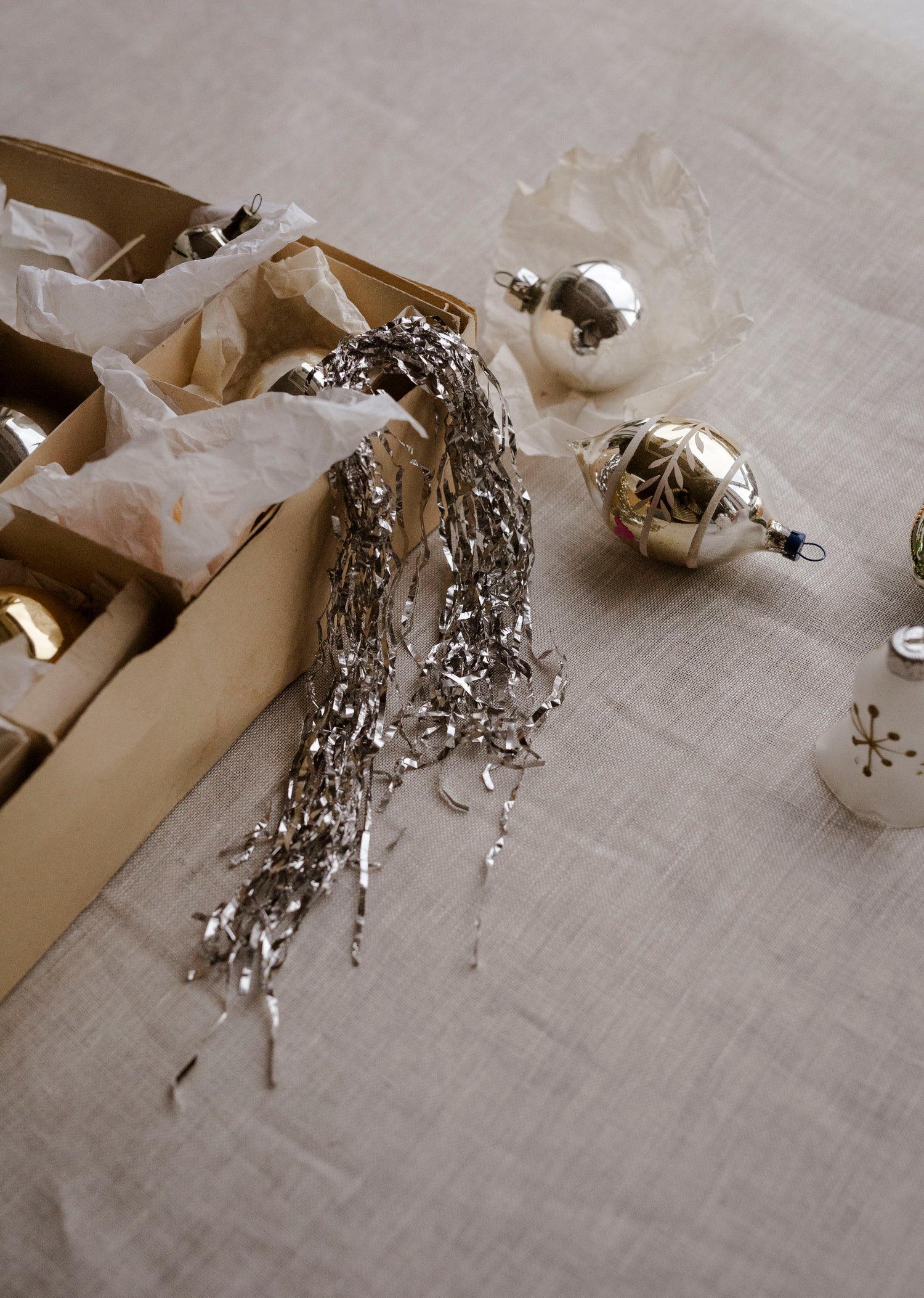 Det er noe helt spesielt med det vakre metallglitteret: Lyset reflekteres vakkert, og materialets tyngde gir rettere og mer stabile tråder og mykere bevegelser enn sin etterkommer i plast. Vi er glade for å ha funnet tinsel som er akkurat som det var i gamle dager, slik at vi kan gjenskape de fantastiske albumbildene av magiske juletrær i dekorerte julestuer. Heng et lite antall spredt og tilfeldig på juletreet, eller kjør på med ekstra mange, for et helt spektakulært juletre. Du kan også ha glitteret på en grønn gren i en vase. Vi synes glitteret er ekstra fint i selskap med gamle og antikke julekuler.