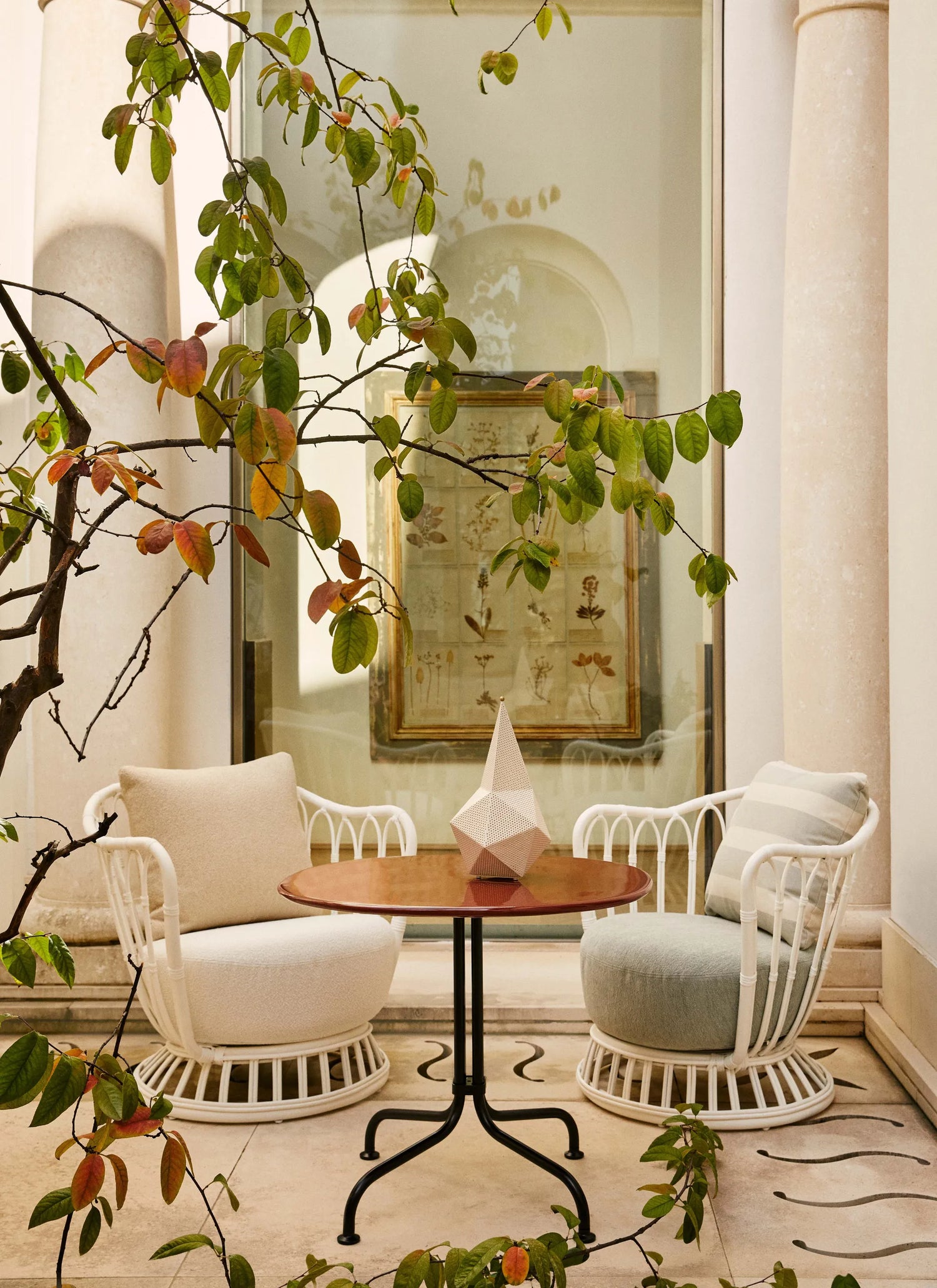 Lenestolen Grace Outdoor Lounge Chair fra Gubi er en ny versjon av den tidløse Grace-lenestolen. Denne varianten er laget med et syntetisk rottingmateriale, bestående av pulverlakkert aluminium som tåler både vær og UV-stråling. Rammen er håndlaget, og hvert element i stolen er nøye utformet for å opprettholde en perfekt balanse mellom teknisk presisjon og håndverkskunst.