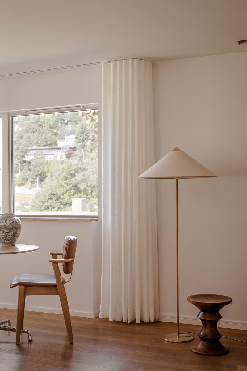 Vi anbefaler svevende gardin når du har wave-oppheng. Da henger de rett over gulvet uten å berøre det. Dette gir et elegant, lett og luftig utseende, og man unngår at den samler støv fra gulvet eller blir slitt nederst. Det gir også et stramt og stilrent uttrykk.