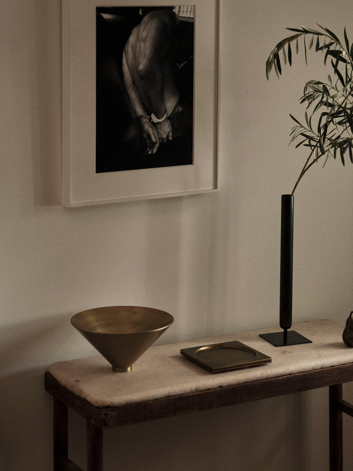 Colin King har designet en serie dekorative objekter for Menu som inspirerer oss til å lage fine stilleben hjemme. Vi elsker den stemningsfulle stilen til Colin King, som preges av dansende former, tunge materialer og store proporsjoner. Den koniske formen på Taper Bowl er stram, symmetrisk og perfekt, men føles allikevel elegant om varm, takket være materialet. Vi er glade i slike dekorative messingobjekter som er som smykker som gir varme og personlig karakter til interiøret.