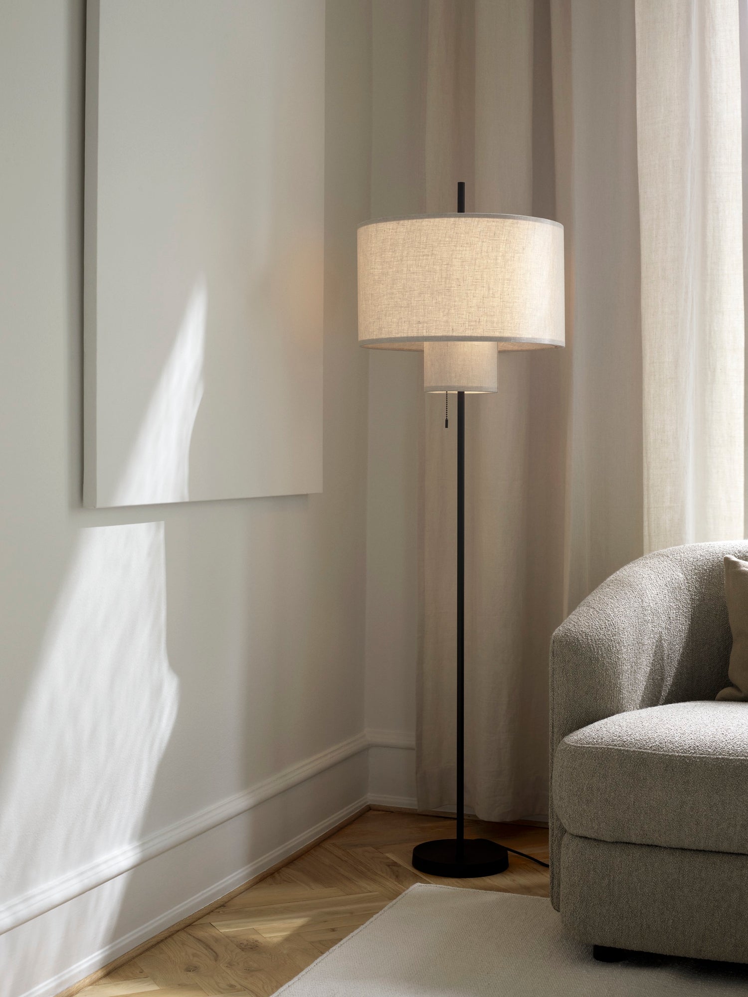 Gulvlampe Margin, designet av John Astbury for New Works. Margin er en lampeserie med bordlampe, pendellamper flere størrelser og en gulvlampe. Serien er en moderne tolkning på den klassiske lampen med tekstilskjerm, og har fått et elegant og rent design, som gir hjemmet et sofistikert løft. Designet er såpass enkelt at du med fordel kan ha flere lamper i samme serie rund om kring i hjemmet. Lampen har svarte detaljer og sandfarget skjerm. Lyset spres mykt gjennom overlappende skjermer og skaper lun stemning stemning med sin varme og taktilitet. Gulvlampen er fin ved sengen, ved sofaen eller i et ledig hjørne i stuen. Pendellampene kan henge over spisebordet - eller sofasonen - en alene eller flere sammen i ulik størrelse. Bordlampen ser vi for oss på en skjenk eller i en viduskarm. En liten detalj vi er ekstra glad i er snorbryteren på gulv- og bordlampen!