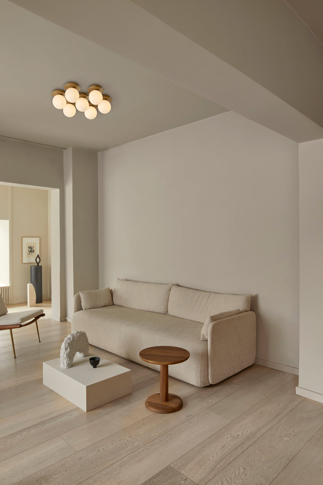 Serien Liila fra Nuura består av ulike typer tak- og vegglamper med kupler i opalglass og armaturer med messingfinish, satt sammen av syv eller tolv kupler i varierende konstellasjoner. Inspirert av glitrende stjerner på nattehimmelen vil disse skulpturelle lampene smykke ethvert rom de plasseres i! Ekstra fine er de som dekorativ belysning på små veggflater eller i et senket tak, enten brukt alene eller flere sammen. Her er det bare å leke seg frem! Det hvite opalglasset sprer et mykt og delikat lys i rommet. Hver glasskuppel er munnblåst.