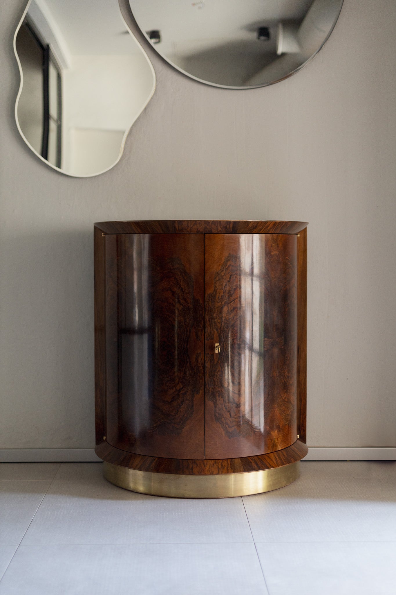 Som dette elegante halvsirkelformede barskapet som utvendig er kledd med en akk-så-vakker og dekorativ høyglans rotfiner av valnøtt og som hviler på en sokkel kledd i patinert messing. Vrir du om på nøkkellåsen i messing deles skapet i to og det åpenbarer seg praktiske hyller på baksiden av dørene samt på innsiden av skapet. Bakveggen er speilbelagt.