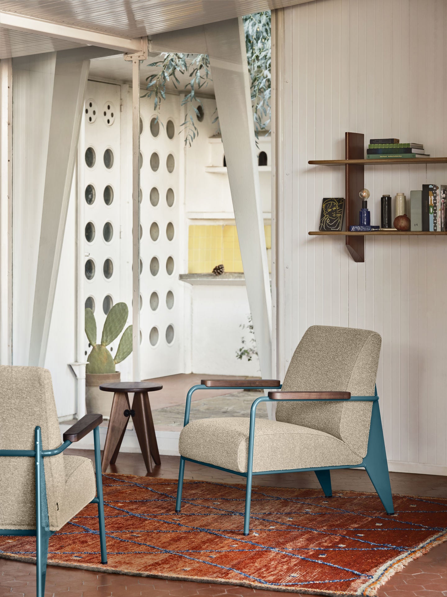 Nye farger! Lenestolen Fauteuil de Salon fra Vitra, ble designet allerede i 1939 av Jean Prouvé. Stolen har delikate og harde linjer. Den har et klart formspråk, som baseres på enkle og estetiske prinsipper. Det var datteren Cathérine Prouvé som oppdaget stolen i blant tegningene i arkivene etter faren. Den ble tilpasset en moderne standard, og satt i produksjon av Vitra.